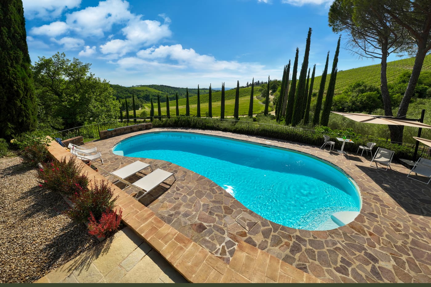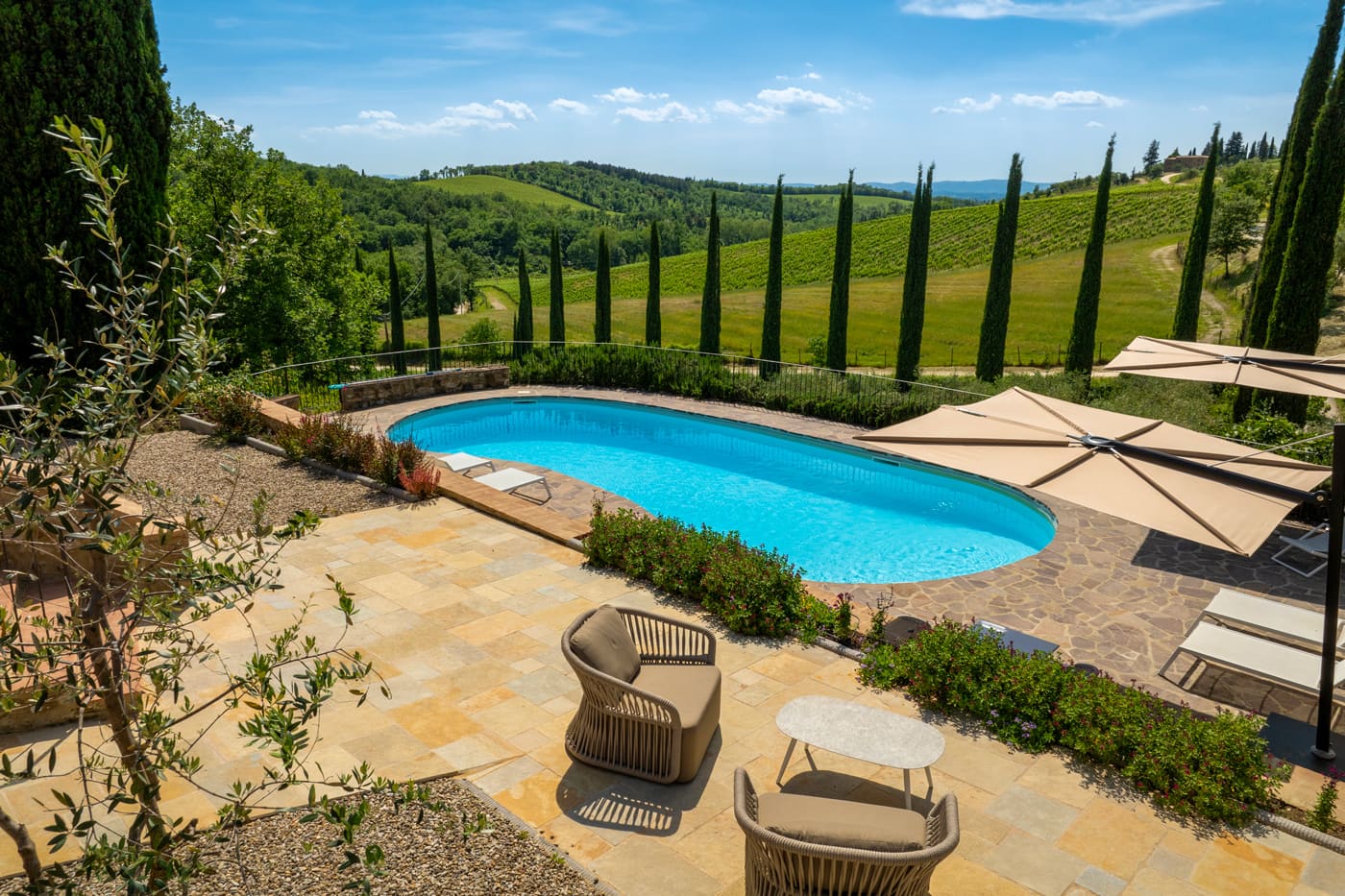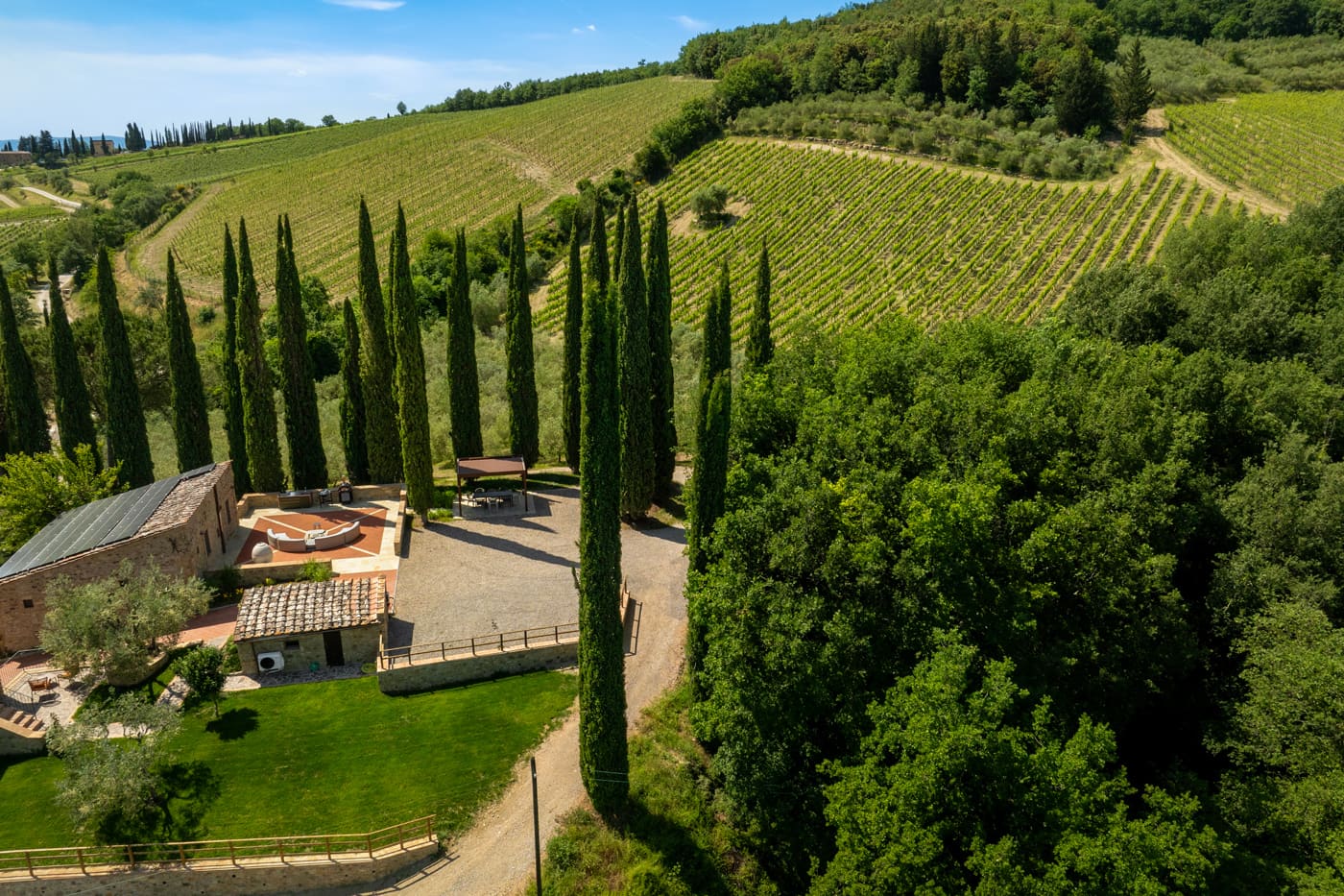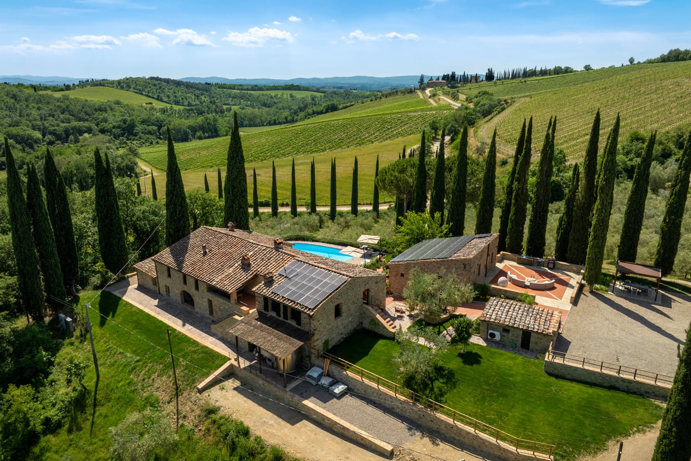 Setriolo is about five kilometres away from the buzzing town of Castellina in Chianti, north of Siena. The area boasts vineyards and olive groves typical of the Tuscan hills.