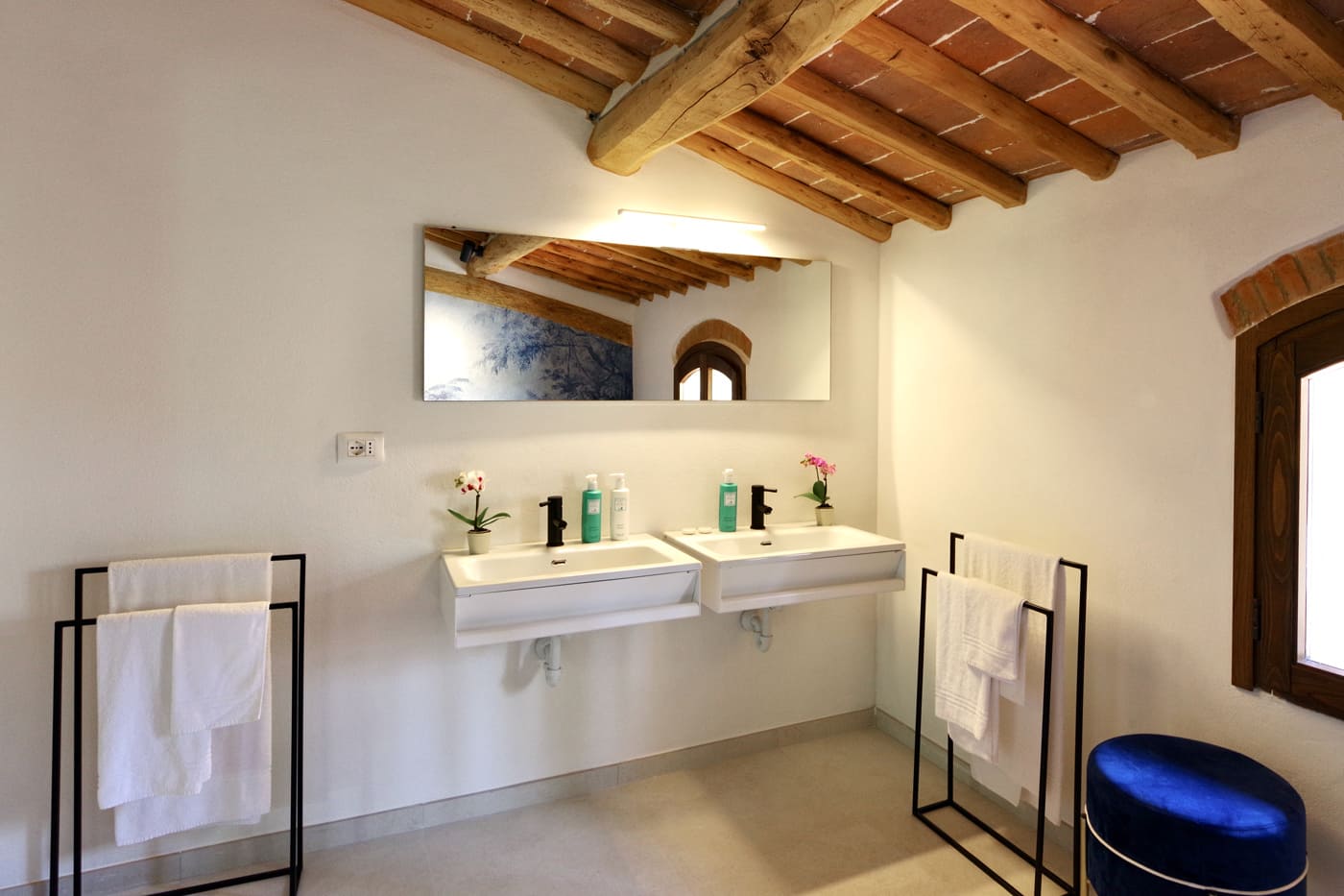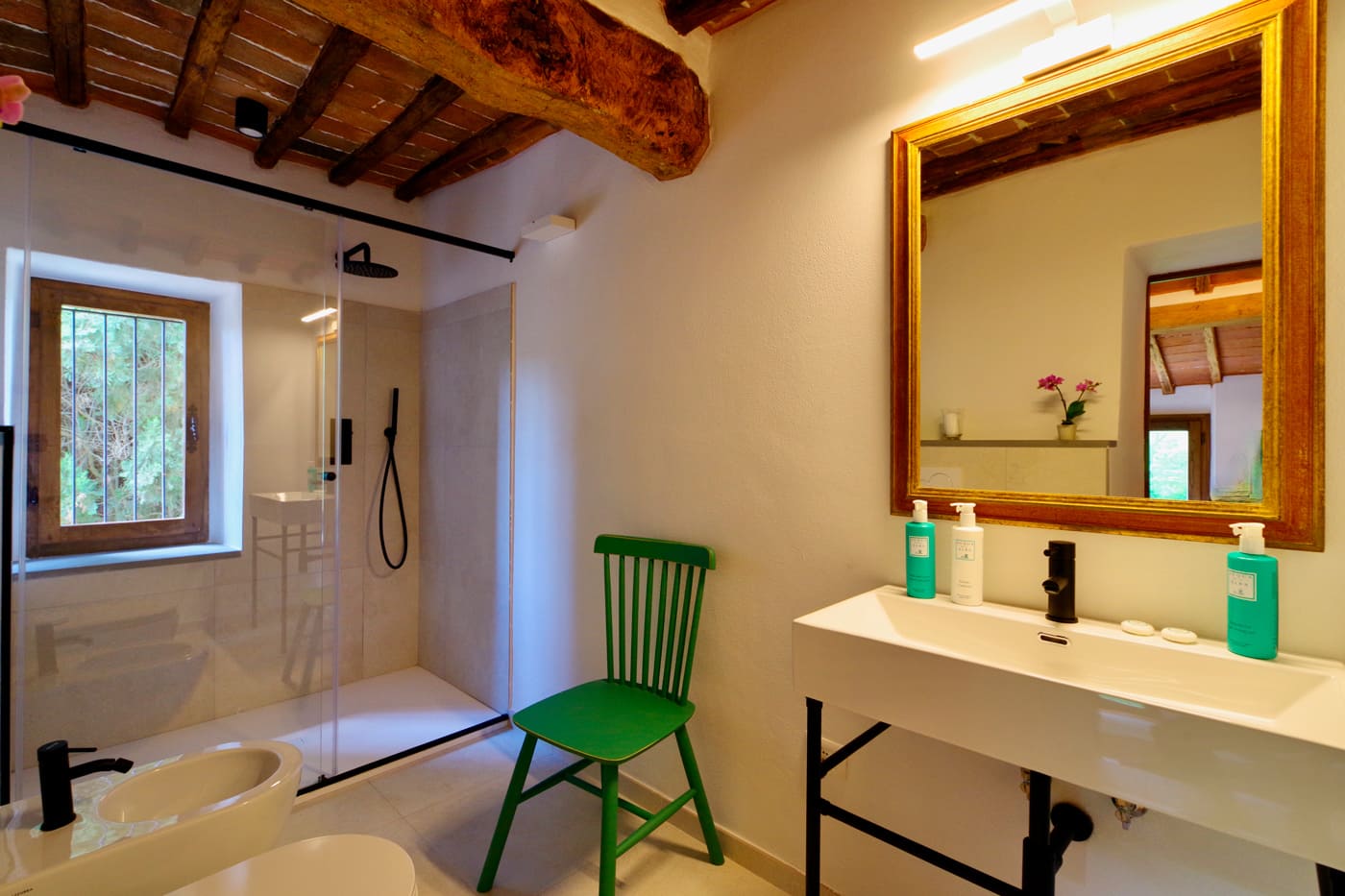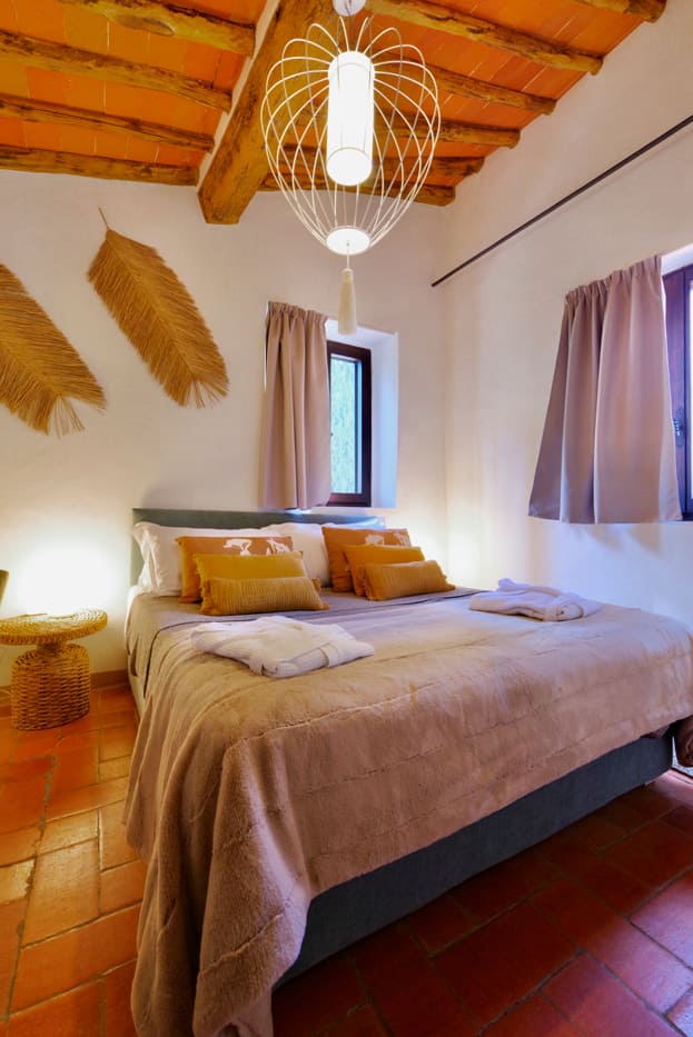 The Podere’s structure consists of a main building, the upper floor of which has been restored into a very comfortable living space, a perfectly appointed kitchen, three bedrooms and three bathrooms and two outdoor terraces. The rooms are modern and tastefully decorated, blending with the retained original features of the building.