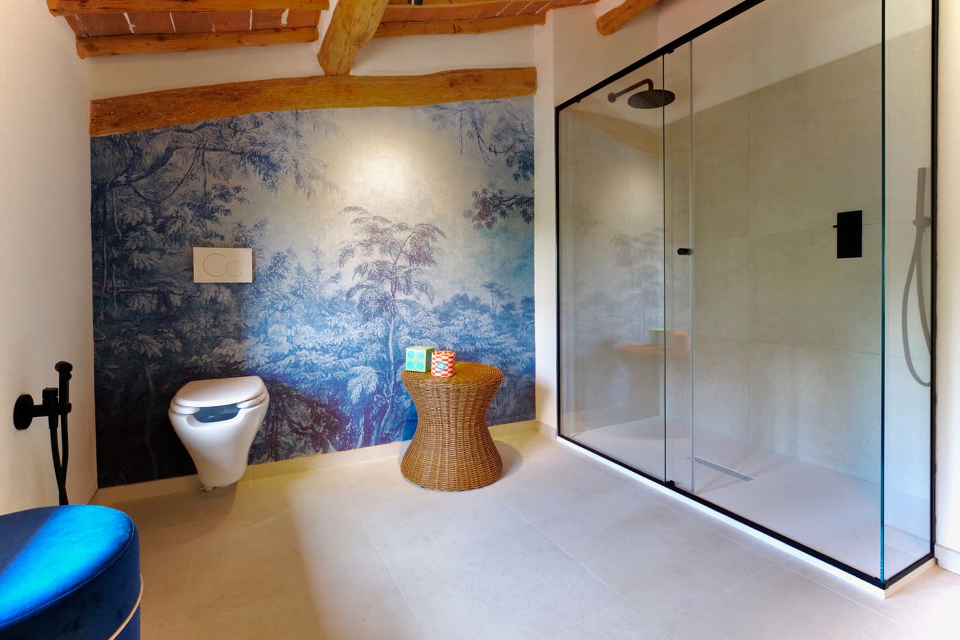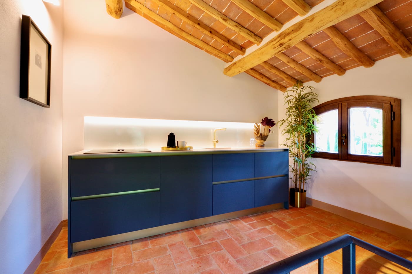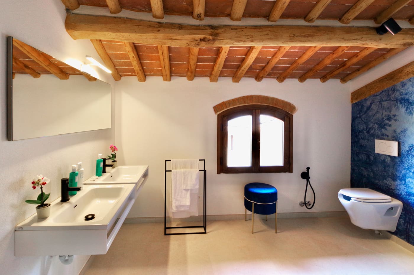 The Podere’s structure consists of a main building, the upper floor of which has been restored into a very comfortable living space, a perfectly appointed kitchen, three bedrooms and three bathrooms and two outdoor terraces. The rooms are modern and tastefully decorated, blending with the retained original features of the building.