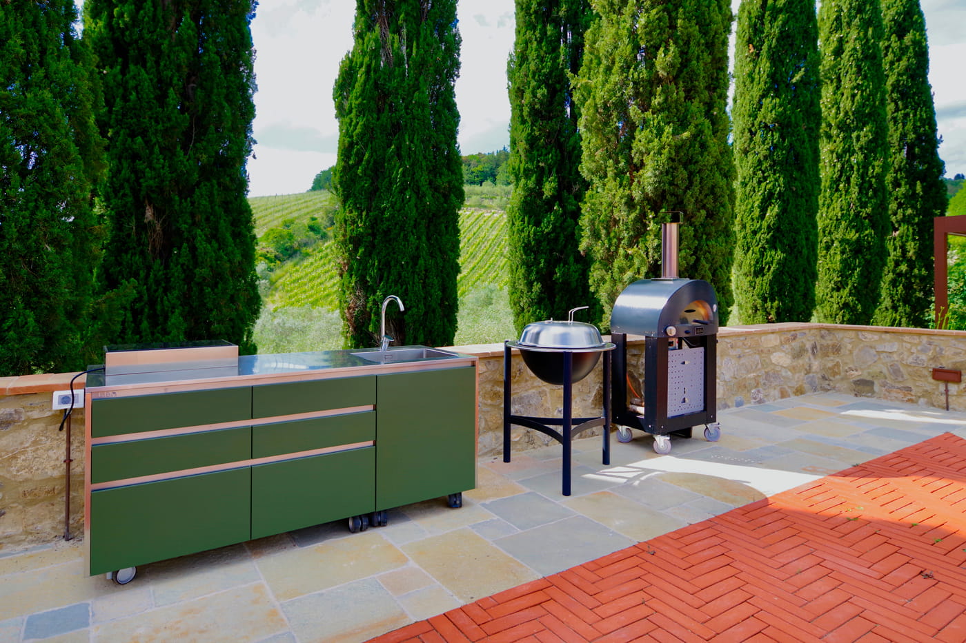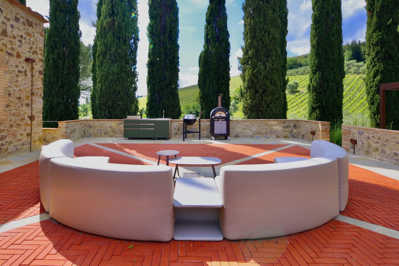 Aside the annex is the barbecue outdoor area which consists of seating, low tables and an outdoor kitchen with stainless steel worktop, induction hob and sink. There is a mobile barbecue and a gas-powered pizza oven. Adjacent to this is a pergola, beneath which is a dining table and seating for ten. Naturally, like the rest of the property the area is surrounded by nature, vines, olives and beautiful views!